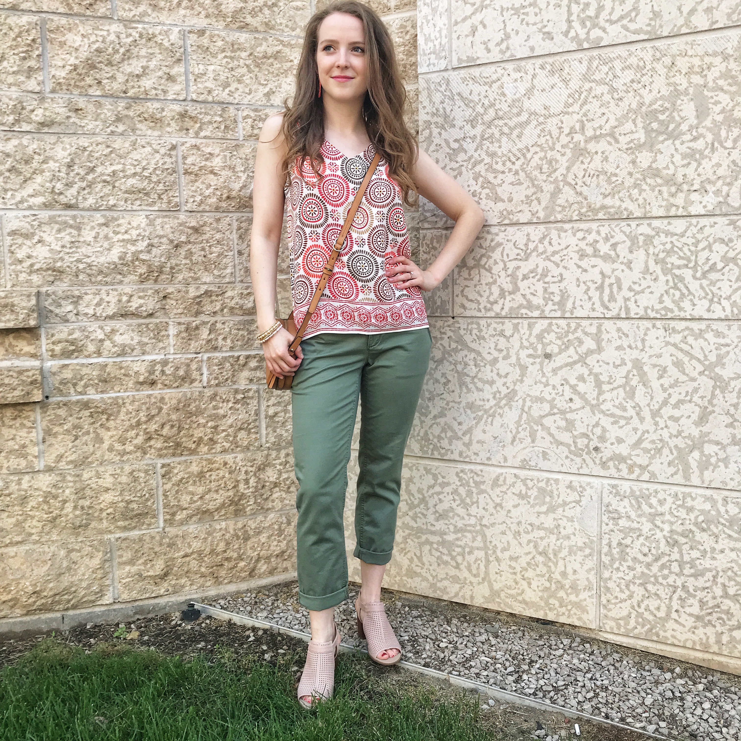 Next is a really cute casual look for running errands or relaxing around the house. These green chino pants are beyond comfortable and I can wear them all day without them pinching or feeling too tight. The fabric is also exceptionally soft. I paired this look with a simple circle bag and these Franco Sarto Monaco dress sandals.